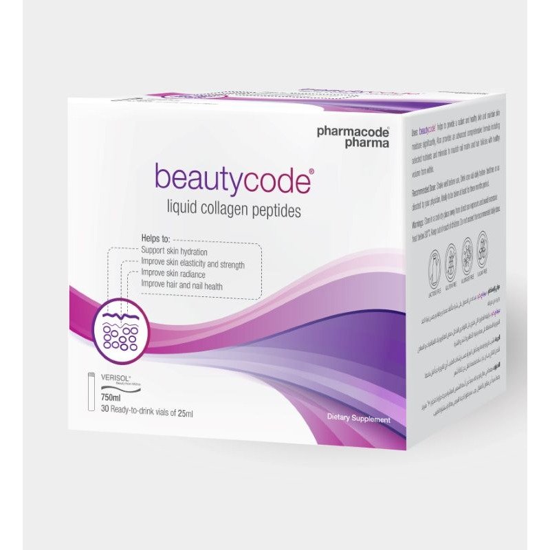 بيوتي كود® مكمل غذائي غني بببتيدات الكولاجين النشطة بيولوجيًا من فيريسول®، وحمض الهيالورونيك، وفيتاميني سي وهـ، والبيوتين، والزنك، والسيلينيوم. هذا المشروب المضاد للشيخوخة بنكهة الفراولة يُعزز الكولاجين.